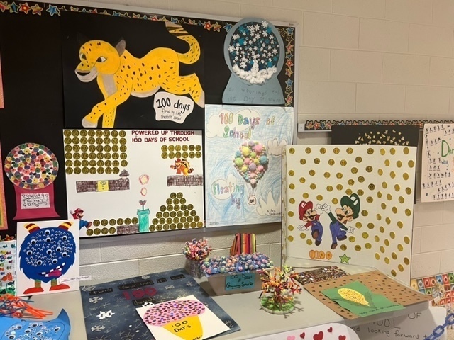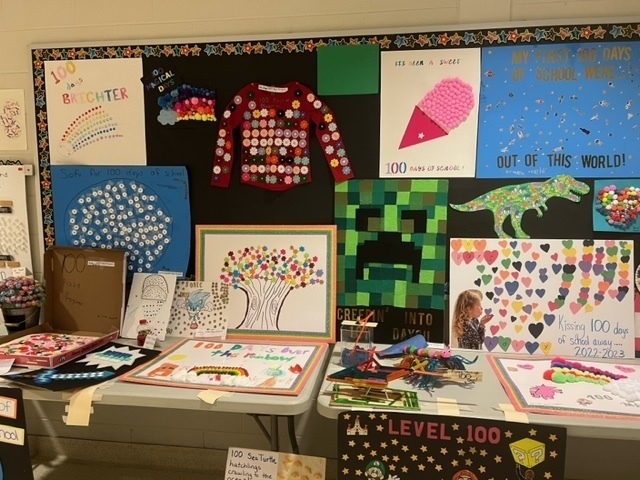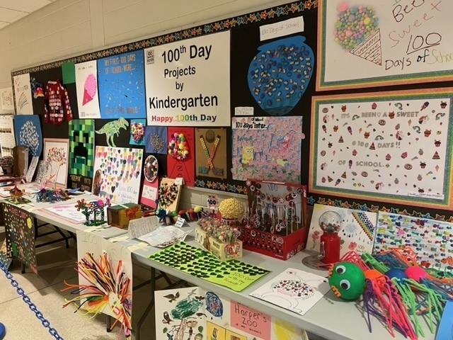 Kindergarten celebrated the 100th Day of School. Students made projects with 100 items for the 100 days of school and classrooms celebrated the day.